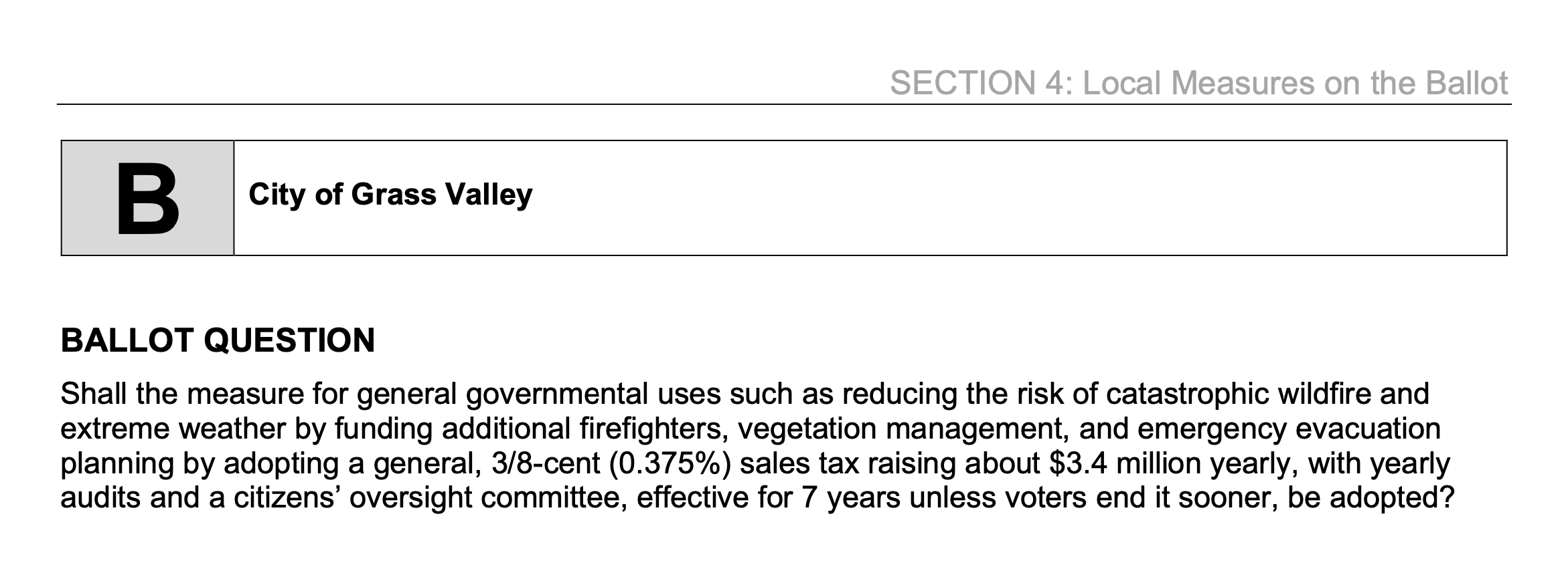 The City of Grass Valley proposes another sales tax hike to voters, Measure B, which will add 0.375% to the 1% sales tax passed in 2018 as Measure E. If passed, the sales tax in the City of Grass Valley will total 8.875%. With revenue from Measure E amounting to around $7 million a year, City leaders believe an additional tax hike is necessary to pay for a higher level of service of fire prevention and response.