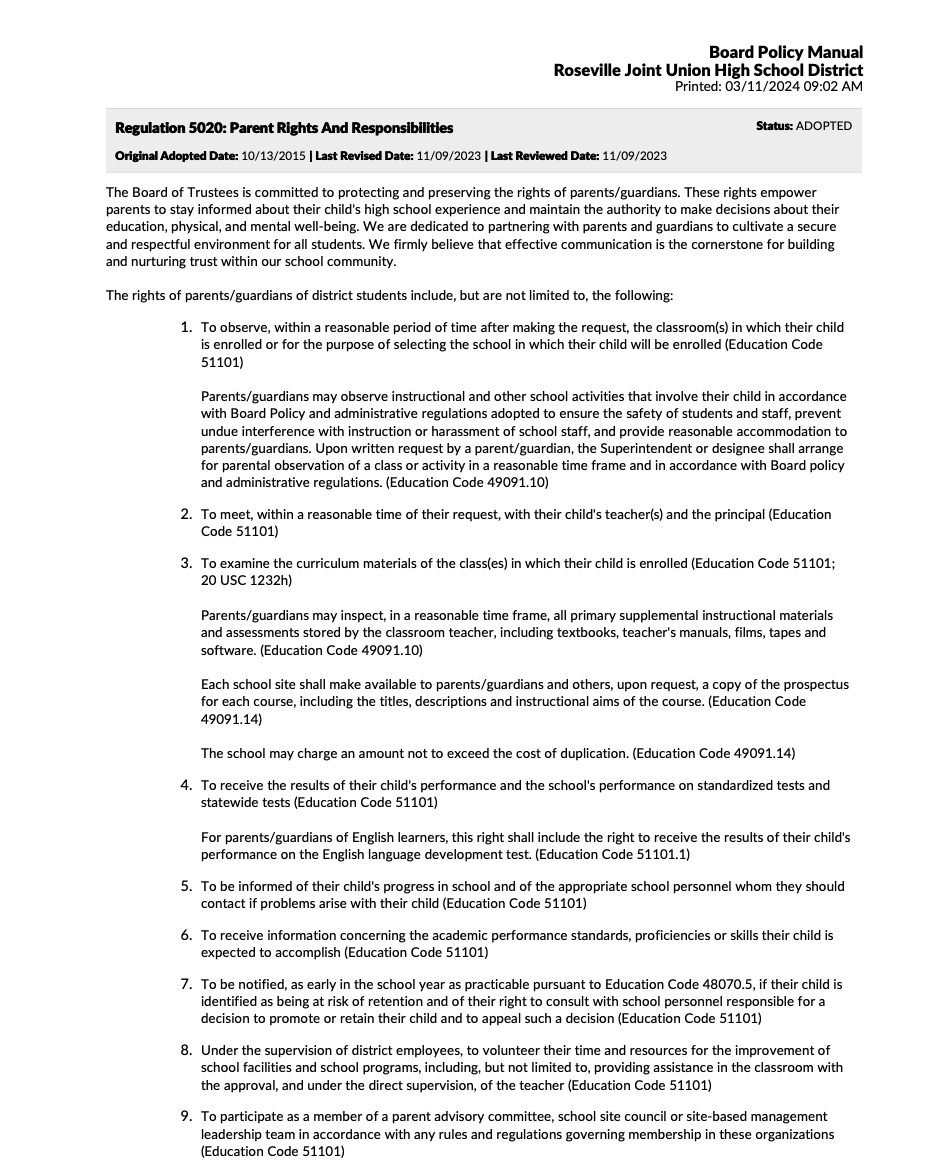 Board Policy Manual: Regulation 5020: Parent Rights And Responsibilities