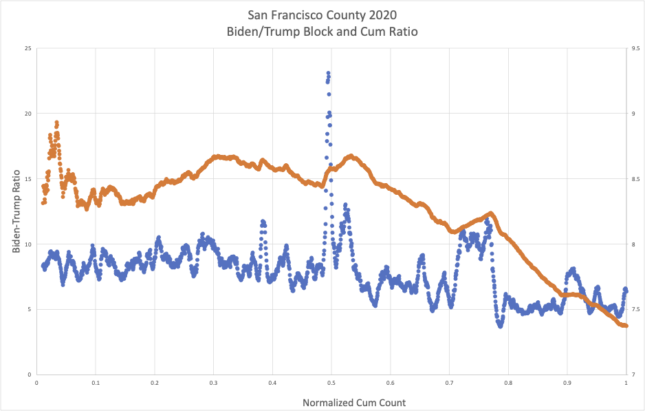 On the horizontal axis, we see the “normalized” count of ballots. This is the fraction of ballots counted over the entire election. On the vertical axis, we see the “Biden to Trump” ratio. This means that for a set number of consecutive ballots, as represented on the raw CVR data, the number of Biden votes is divided by the number of Trump votes. For example, a ratio of “10” on the vertical axis means that there are 10 Biden votes to every 1 Trump vote.