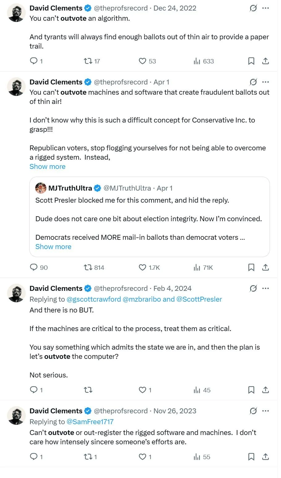 X posts from “The Professor” David Clements, an election integrity influencer who broadcasts that voters “can’t outvote the machines.”